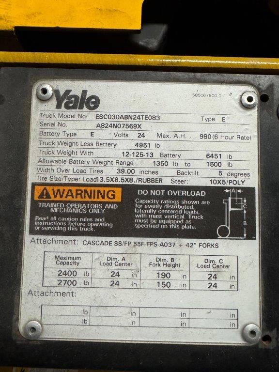 Located in Midland, MI Battery Powered Forklift Yale ESC030ABN24TE083 24 Volt, removed form service for weak battery. Dow Unit FT 6027 HOURS OF OPERATION: 7:00am - 5:30pm EST, Mon - Thurs Contact: David Callahan Office: (989) 633-0985 email: dcallahan@dow.com Sold As-Is, Where-Is Bidding Closes on Dow’s acceptance of a qualifying bid Sealed Bidding starts at $300 DOW RESERVES THE RIGHT TO REJECT ANY AND/OR ALL BIDS LOAD OUT: This lot will be loaded onto buyer's truck free of charge. Buyer is responsible for securing the load and logistics